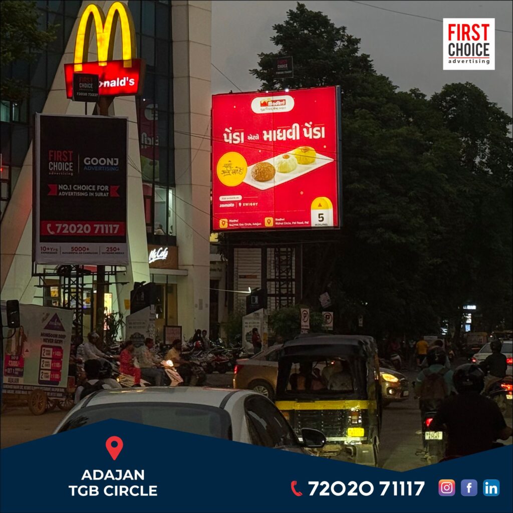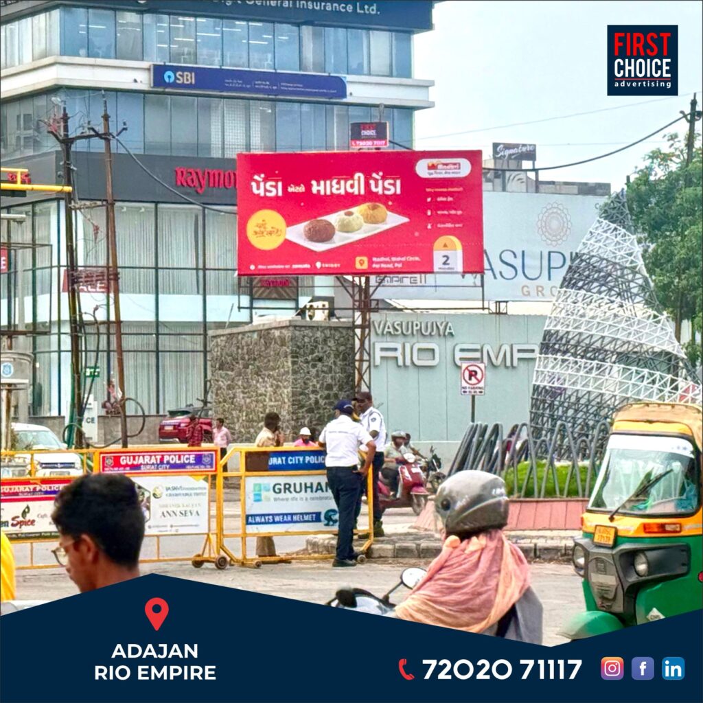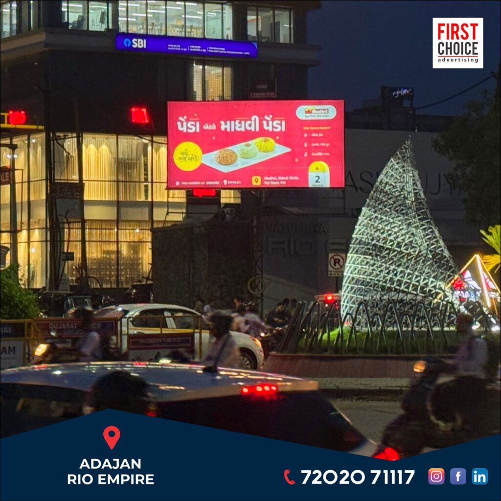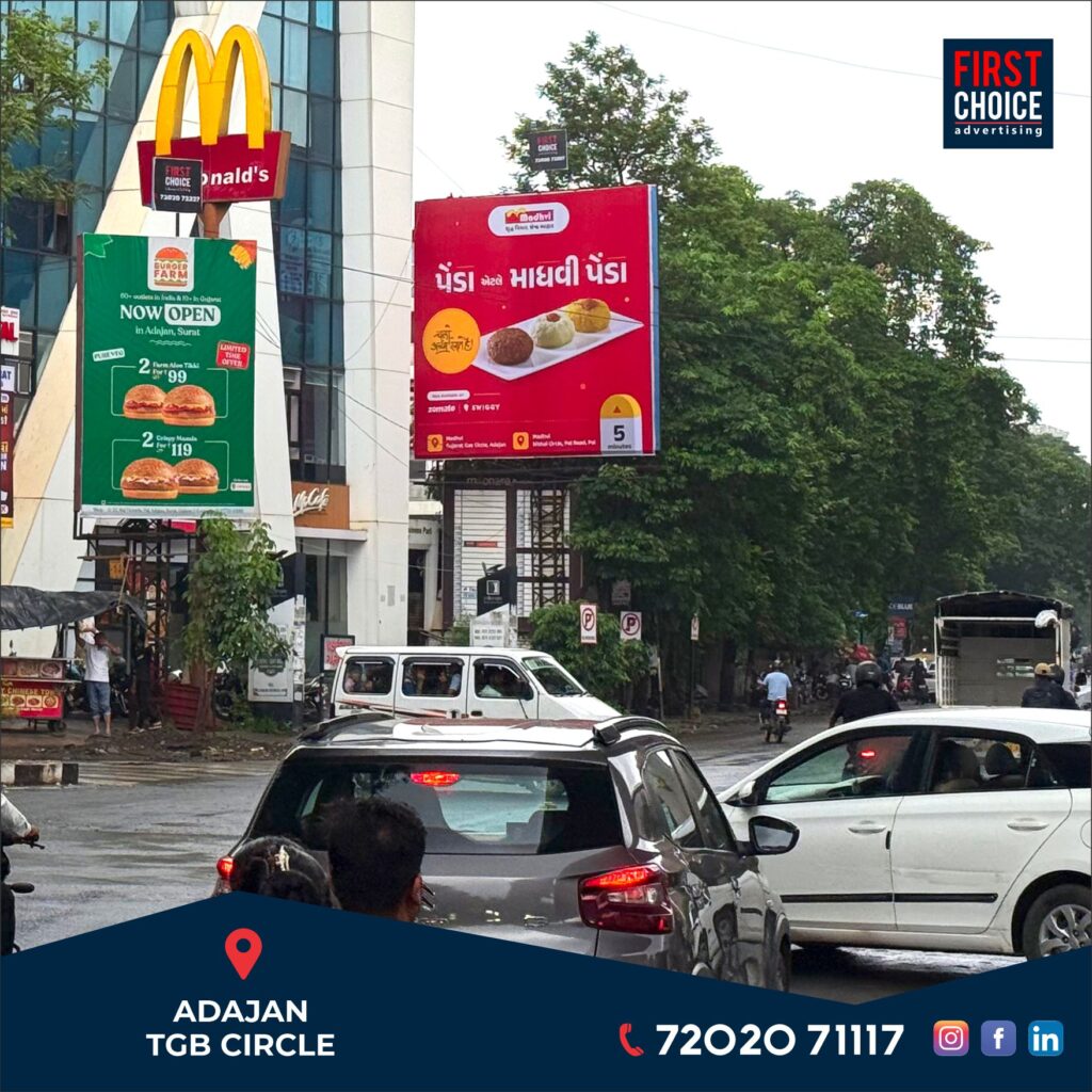 The campaign was primarily targeted towards families and individuals in Surat who regularly purchase sweets. And As the new outlet was opened in Pal, Adajan so Broadly, We Helped Madhvi Dairy to Target the almost whole Pal Adajan area with our Prime & Strategically backlit Hoardings. [Hoarding Location- TGB Hotel, Adajan & Second Location- Rio Empire, Adajan].