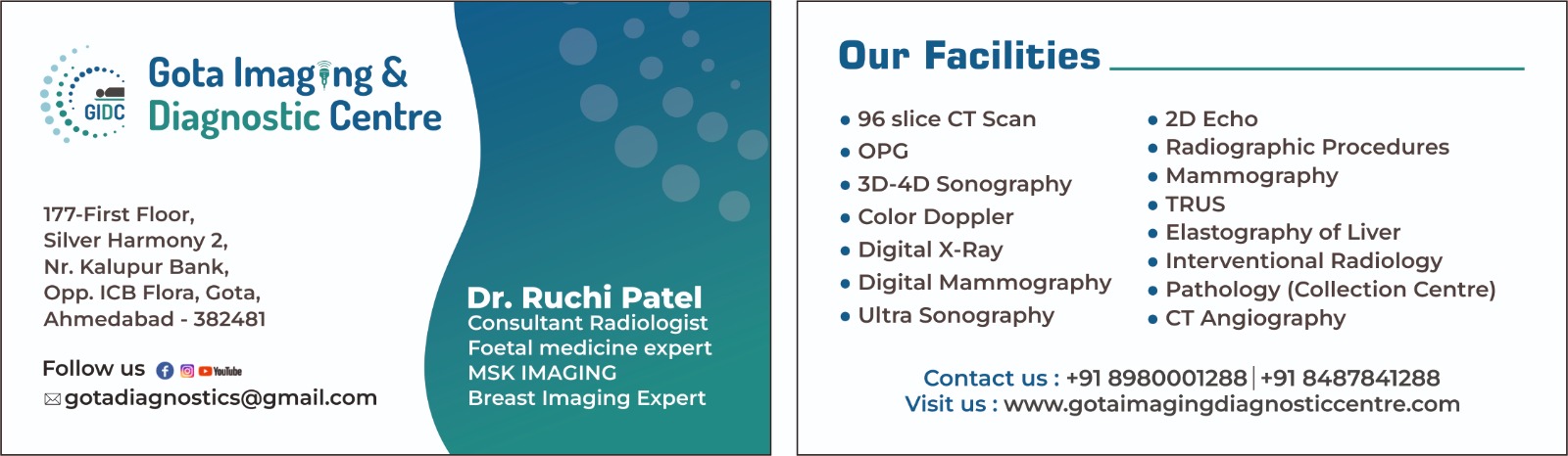 Hello, I’m Dr. Ruchi Patel, a Consultant Radiologist at Gota Imaging & Diagnostic Centre, Ahmedabad. I specialize in foetal medicine, MSK imaging, and breast imaging. At our centre, we offer a comprehensive range of diagnostic services including CT scans, sonography (3D/4D and Doppler), digital X-rays, mammography, interventional radiology, and pathology support. Our focus is to provide accurate, reliable, and patient-centric diagnostic care using advanced technology. You can visit us at Gota, Ahmedabad, or contact us for any diagnostic requirements.