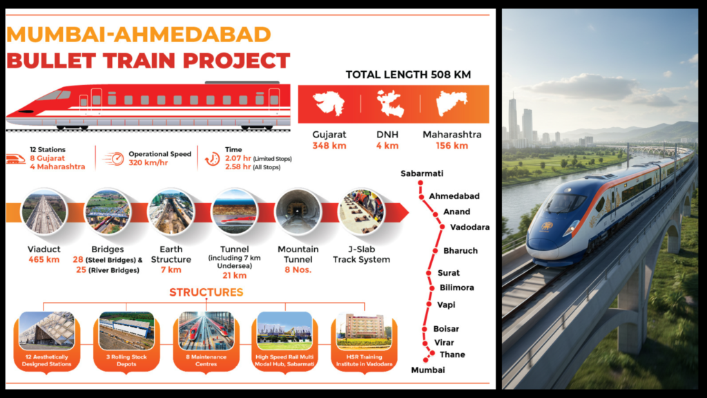 Moreover, progress in Gujarat is rapid. Over 260 km of viaducts are already complete, making it the fastest-moving section. In addition, India’s first under-sea rail tunnel near Thane Creek sets a new global engineering benchmark. The Sabarmati Multimodal Transport Hub is also reshaping the urban landscape by bringing high-speed rail, metro, BRT, and city rail to a single integrated location.